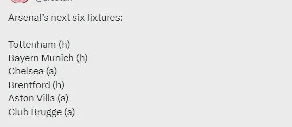 阿森纳未来6场比赛:主战热刺、主战拜仁、客战切尔西、主战布伦特福德、客战维拉、客战布鲁日。