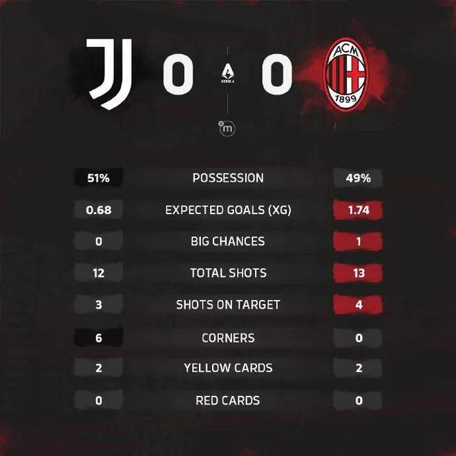 下半场伤停补时3分钟,全场比赛结束,最终米兰0-0尤文图斯。